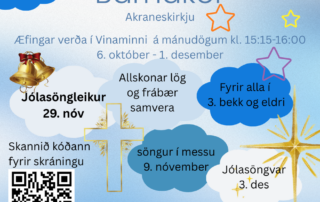 Barnakór Akraneskirkju tekur til starfa nú í haust og er það okkur ánægjuefni að bjóða upp á barnakór eftir nokkuð langt hlé þar á. Kórinn er fyrir börn í 3. bekk og upp úr og hvetjum við öll börn í prestakallinu sem áhuga hafa að vera með! Æfingar fara fram á mánudögum í Safnaðarheimilinu Vinaminni kl. 15:15-16:00 Stjórnandi er Katrín Valdís Hjartardóttir, söngkona og tónmenntakennari. Katrín Valdís hefur áralanga reynslu af kennslu og að [...]
