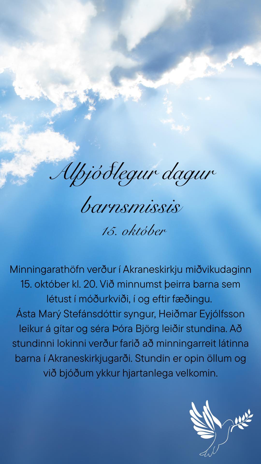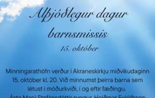 Alþjóðlegur dagur barnsmissis miðvikudaginn 15. október.Minningarstund verður í Akraneskirkju kl. 20. Við minnumst þeirra barna sem létust í móðurkviði, í og eftir fæðingu. Ásta Marý Stefánsdóttir syngur, Heiðmar Eyjólfsson leikur á gítar og séra Þóra Björg leiðir stundina.Að stundinni lokinni verður farið að minningarreit látinna barna í Akraneskirkjugarði. Stundin er opin öllum og við bjóðum ykkur hjartanlega velkomin.