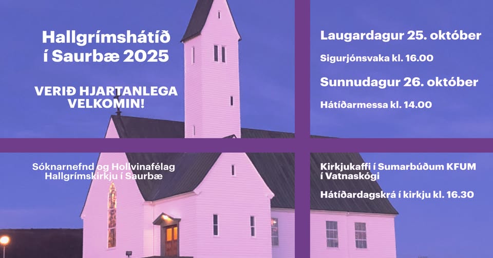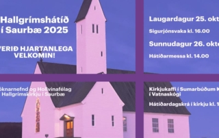 Verið hjartanlega velkomin til Hallgrímshátíðar 2025 Hallgrímshátíð verður haldin helgina 25.- 26.október í Hallgrímskirkju í Saurbæ Hallgrímshátíð hefur fest sig í sessi í prestakallinu okkar og er haldin í tengslum við dánardag Hallgríms Péturssonar, 27. október. Laugardagur 25. október kl. 16 Sigurjónsvaka; Dagskrá í tali og tónum um sálma sr. Sigurjóns Guðjónssonar prests í Saurbæ á árunum 1931-1966. Flytjendur eru Kór Saurbæjarprestakalls hins forna, Ásta Marý Stefánsdóttir, sópran og Erla Rut Káradóttir, stjórnandi og [...]