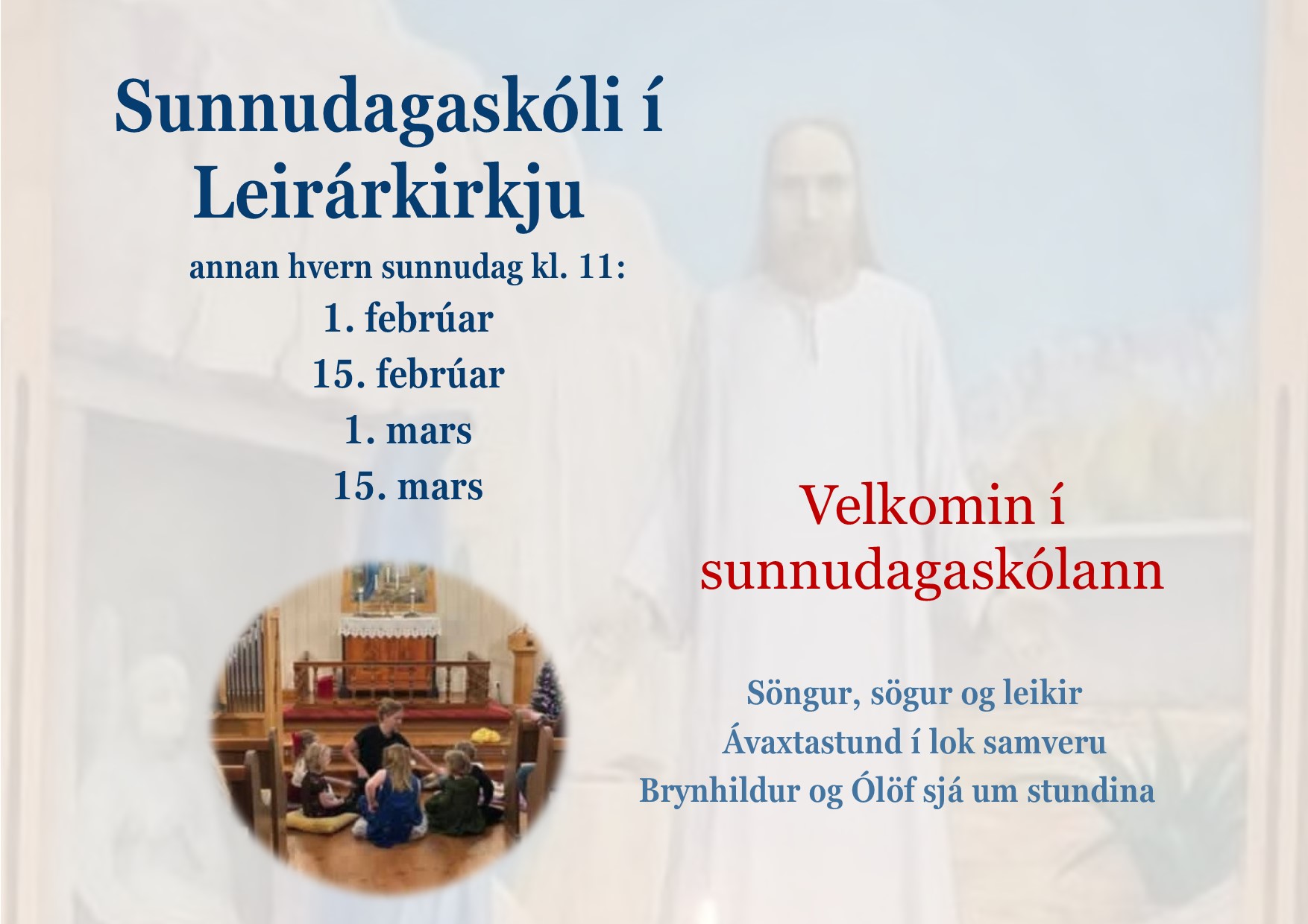 Velkomin í kirkju sunnudaginn 18. janúar Leirárkirkja Sunnudagaskóli kl. 11 Við byrjum með sunnudagaskóla í Leirárkirkju og verðum annan hvern sunnudag. Biblíusaga, söngur og fleira skemmtilegt fyrir börn og fullorðna. Umsjón hafa Brynhildur Karlsdóttir og Ólöf Margrét. Akraneskirkja Sunnudagaskóli kl. 11 Alda og Andri taka á móti krökkunum að venju. Söngur, saga og fleira, allir fá límmiða í bókina sína. Kvöldmessa kl. 20 Sr Ólöf Margrét þjónar. Kór Akraneskirkju leiðir söng, organisti Arnhildur Valgarðsdóttir. [...]
