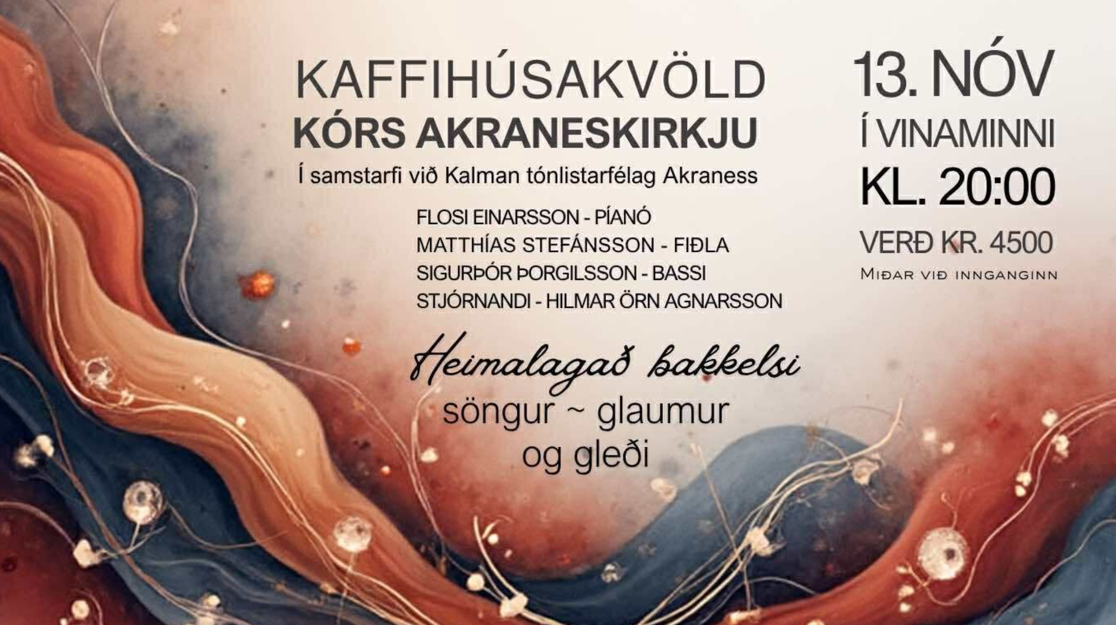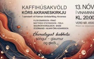 KÓR AKRANESKIRKJU OG KALMAN tónlistarfélag Akraness standa fyrir hinni árlegu og rómuðu gleði- og gúmmulaði sprengju nk. fimmtudagskvöld 13. nóvember kl. 20 í Vinaminni. Fram koma ásamt Kór Akraneskirkju Flosi Einarsson píanóleikari, Matthías Stefánsson fiðluleikari og Sigurþór Þorgilsson bassaleikari. Stjórnandi er Hilmar Örn Agnarsson. Boðið verður upp á hið rómaða bakkelsi kórsins með kaffinu. Fjölbreytt og skemmtileg dagskrá í anda Skagamanna. Miðasala við innganginn. Miðaverð er kr. 4.500 og kr. 4.000 fyrir Kalmansfélaga. Allir [...]