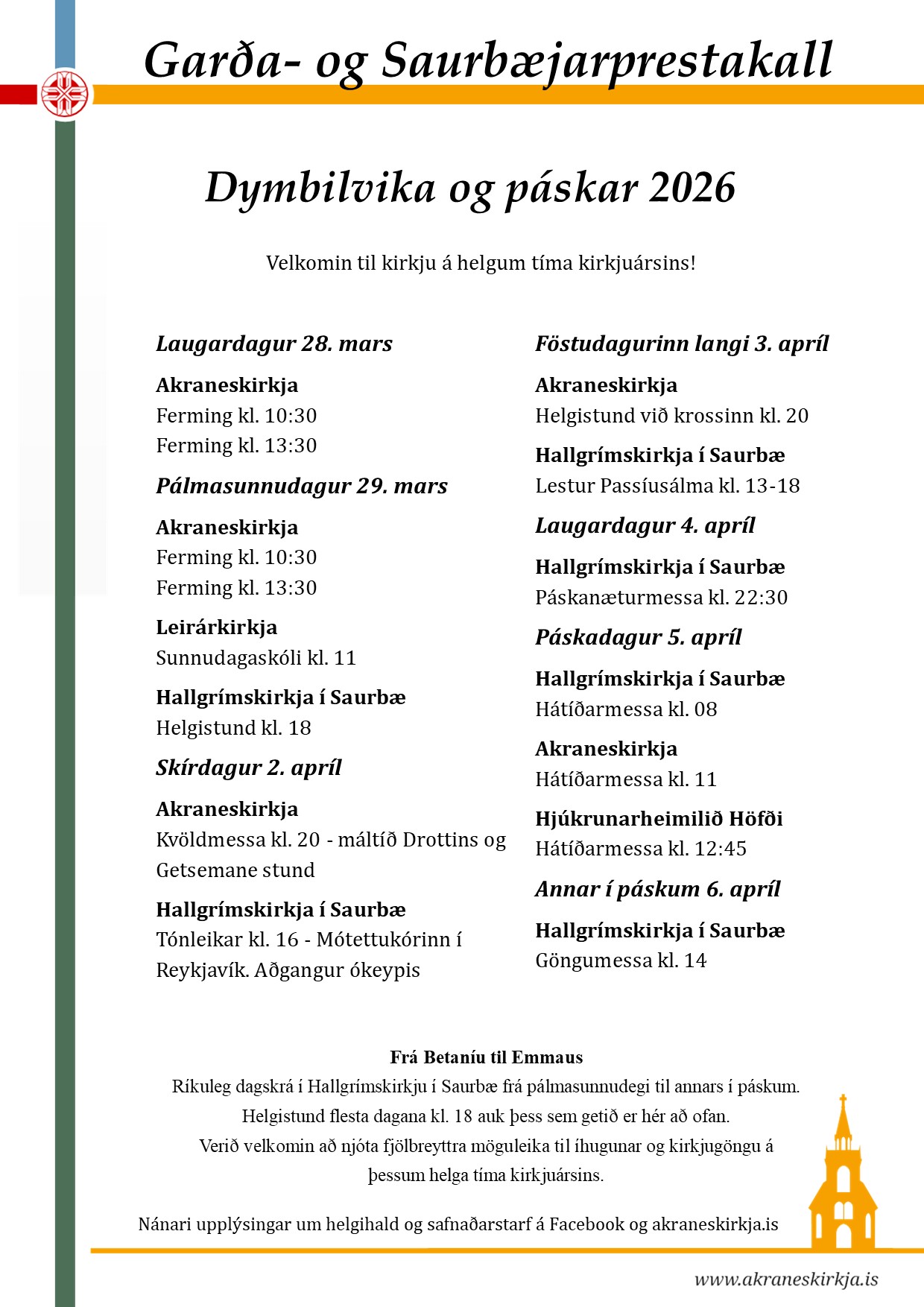 Frá Betaníu til Emmaus Í dymbilviku og um páska verður sem fyrr ríkuleg dagskrá í Hallgrímskirkju í Saurbæ - verið velkomin! Dagskráin er alla daga frá pálmasunnudegi til annars páskadags og fer fram í kirkjunni en einnig við Hallgrímslind og Hallgrímsstein og á grunni gömlu kirkjunnar við gröf Hallgríms. Dagskráin er klukkan sex síðdegis og tekur um 45 mínútur. Umsjón með dagskránni hefur séra Kristján Valur Ingólfsson. Á skírdag kl. 16.00 verða kórtónleikar sem [...]