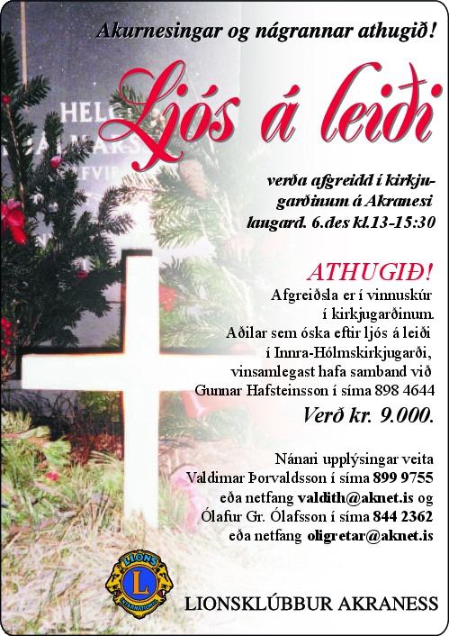 Ljós a leiði verða afgreidd í kirkjugarðinum á Akranesi laugardaginn 6. desember frá kl. 13.00 til 15.30. ATHUGIÐ. Afgreiðslan er í skúrnum í kirkjugarðinum. Aðilar sem óska [...]