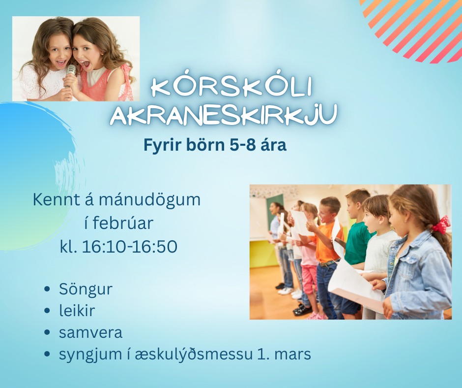 Í febrúar bjóðum við upp á kórskóla fyrir 5-8 ára í umsjá Katrínar Valdísar. Í kórskólanum er söngur, leikir og samvera auk þess sem börnin syngja í fjölskyldumessu.