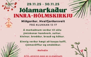 Jólamarkaður Innra-Hólmskirkju, dagana 29. og 30. nóvember í Miðgarði, Hvalfjarðarsveit frá klukka 13 til 17 báða dagana. Á markaðnum verður til sölu ýmiskonar handverk, sultur, kleinur, broddur, brauð og kökur. Einnig verður hægt að kaupa kaffi, rjómavöfflur og smákökur. Nefndin Ath enginn posi á staðnum