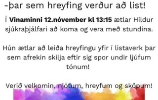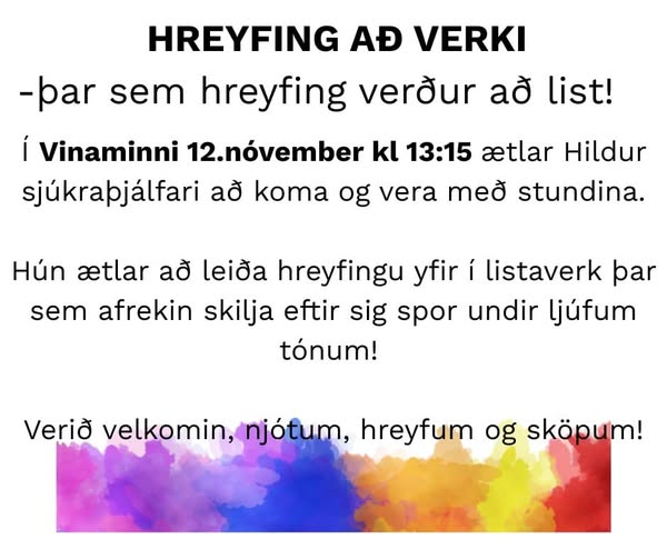 Miðvikudagur 12. nóvember Kyrrðarstund í Akraneskirkju kl. 12:10 og súpa í Vinaminni eftir stundina, kr. 1000 Opið hús í Vinaminni kl. 13:15 Hreyfing að verki - þar sem hreyfing verður list Hildur A. Ingadóttir sjúkraþjálfari kemur til okkar. Hún ætlar að leiða hreyfingu yfir í listaverk þar sem afrekin skilja eftir sig spor undir ljúfum tónum. Verið velkomin! Njótum, hreyfum og sköpum.