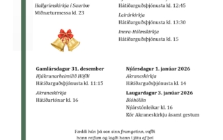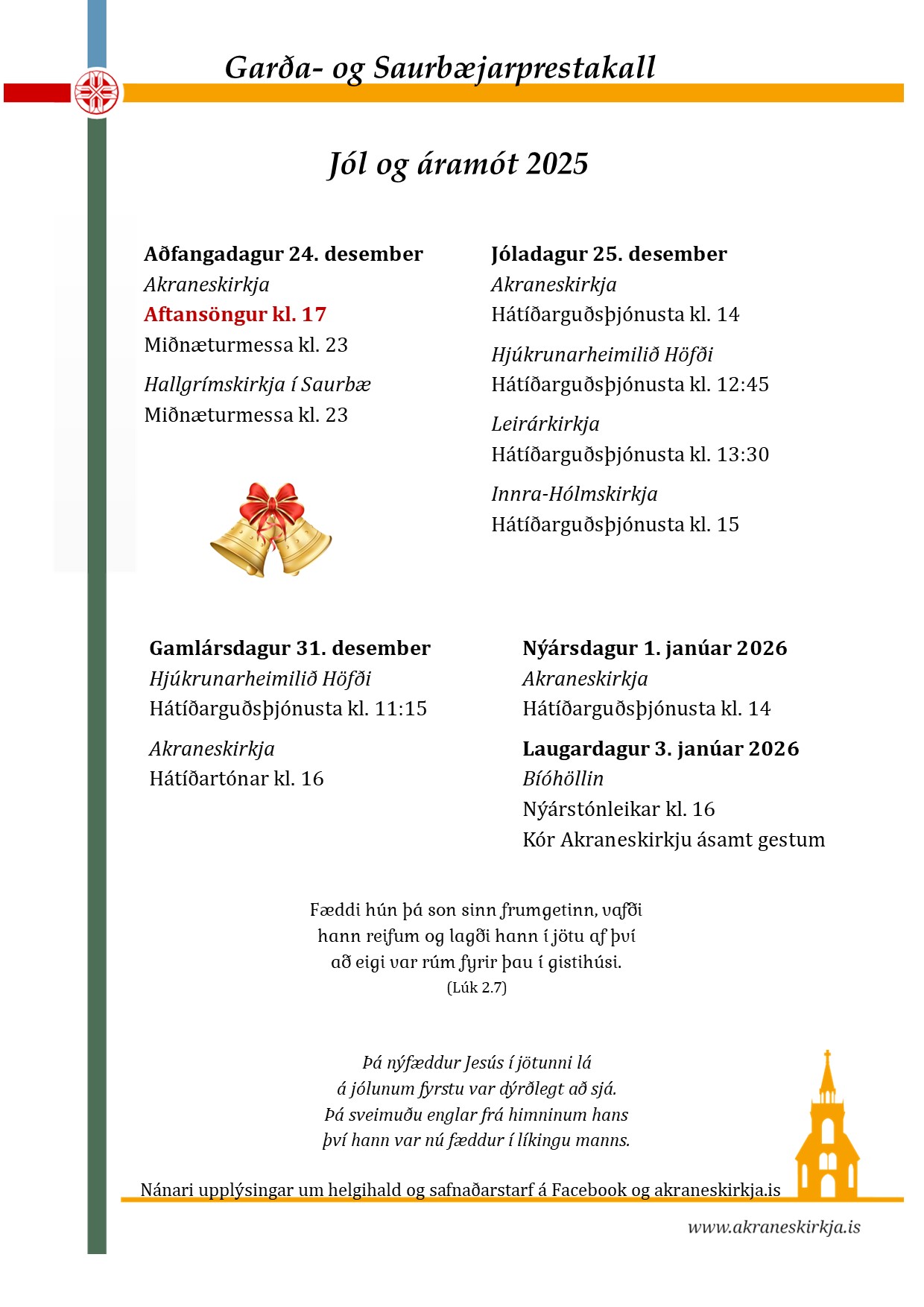 Helgihald um jól og áramót verður með sama sniði og verið hefur undanfarin ár, að því undanskyldu að aftansöngur í Akraneskirkju á aðfangadag verður kl. 17. Aðfangadagur 24. desember Akraneskirkja Aftansöngur kl. 17 Miðnæturmessa kl. 23 Hallgrímskirkja í Saurbæ Miðnæturmessa kl. 23 Jóladagur 25. desember Akraneskirkja Hátíðarguðsþjónusta kl. 14 Hjúkrunarheimilið Höfði Hátíðarguðsþjónusta kl. 12:45 Leirárkirkja Hátíðarguðsþjónusta kl. 13:30 Innra-Hólmskirkja Hátíðarguðsþjónusta kl. 15