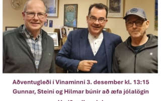 Miðvikudagur 3. desember Kyrrðarstund í Akraneskirkju kl. 12:10 - súpa í Vinaminni á eftir Opið hús í Vinaminni - aðventugleði - dagskrá hefst kl. 13:15 Upplestur, söngur og gaman á aðventugleðinni og að sjálfsögðu smákökur. Tveir fræknir Skagamenn gleðja okkur með söng, þeir Gunnar Már Ármannsson og Sigursteinn Hákonarson. Hilmar Örn organisti leikur undir. Verið velkomin!