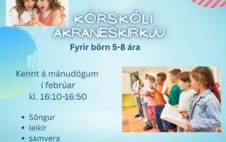 Kórskóli fyrir yngri börnin Í febrúar bjóðum við upp á kórskóla fyrir 5-8 ára í umsjá Katrínar Valdísar. Í kórskólanum er söngur, leikir og samvera auk þess sem börnin syngja í fjölskyldumessu. Æfingar verða á mánudögum í febrúar kl. 16:10-16:50. Ekkert þátttökugjald. Skráning í kórskólann