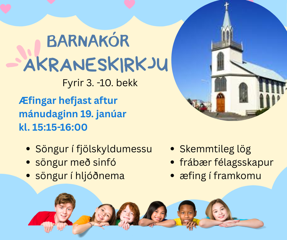 Barnakór Akraneskirkju undir stjórn Katrínar Valdísar tók til starfa sl. haust og mun halda áfram á vorönninni. Meðal verkefna er að syngja í fjölskyldumessu og á tónleikum með Sinfó í maí, auk þess að fá æfingu í framkomu og að syngja í hljóðnema. Barnakórinn er ætlaður 8-16 ára og er ekkert þátttökugjald. Æfingar hefjast mánudaginn 19. janúar kl. 15:15 Smelltu hér til að skrá barn í Barnakórinn
