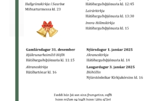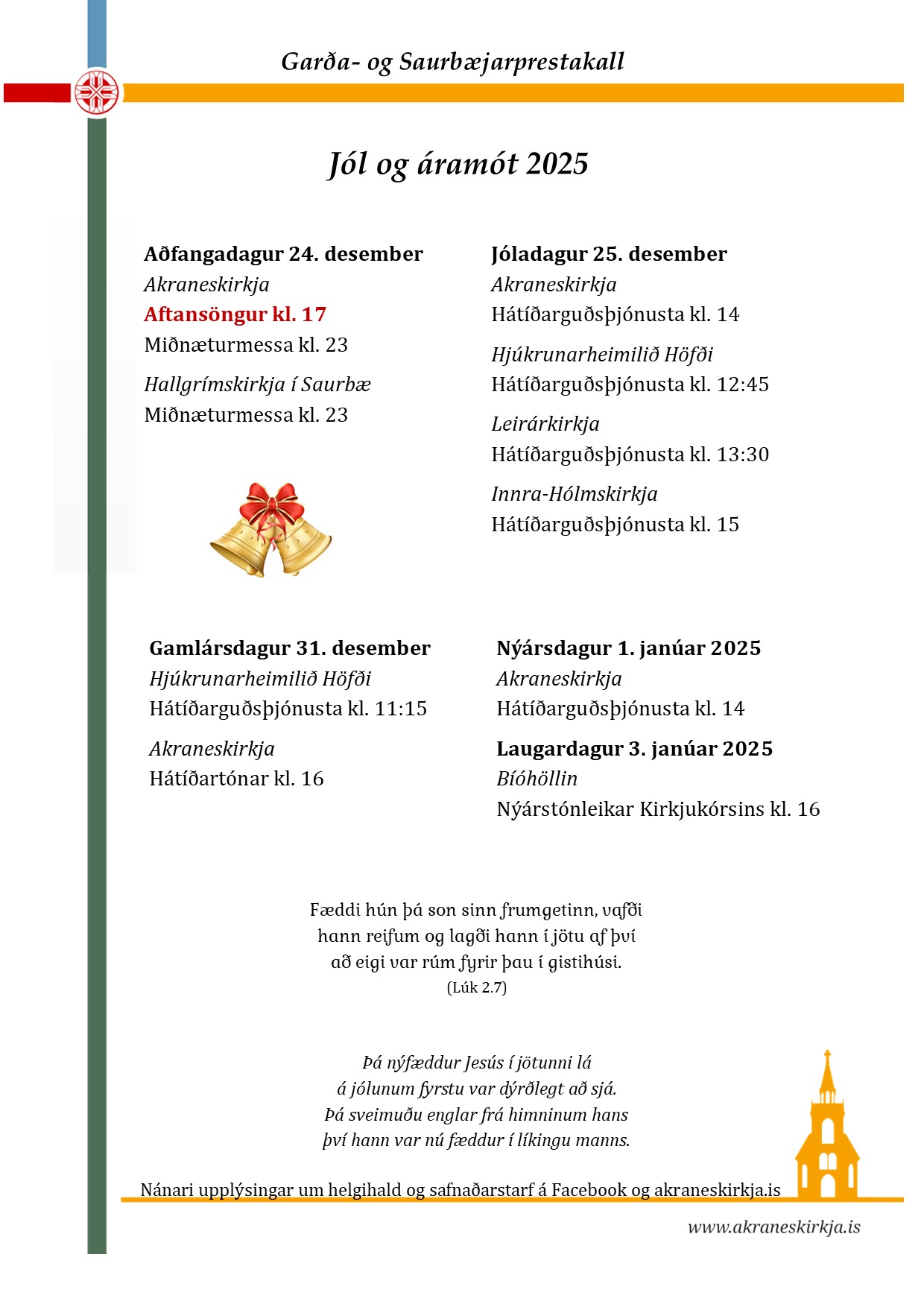 Helgihald um jól og áramót verður með sama sniði og verið hefur undanfarin ár, að því undanskyldu að aftansöngur í Akraneskirkju á aðfangadag verður kl. 17. Aðfangadagur 24. desember Akraneskirkja Aftansöngur kl. 17 Miðnæturmessa kl. 23 Hallgrímskirkja í Saurbæ Miðnæturmessa kl. 23 Jóladagur 25. desember Akraneskirkja Hátíðarguðsþjónusta kl. 14 Hjúkrunarheimilið Höfði Hátíðarguðsþjónusta kl. 12:45 Leirárkirkja Hátíðarguðsþjónusta kl. 13:30 Innra-Hólmskirkja Hátíðarguðsþjónusta kl. 15